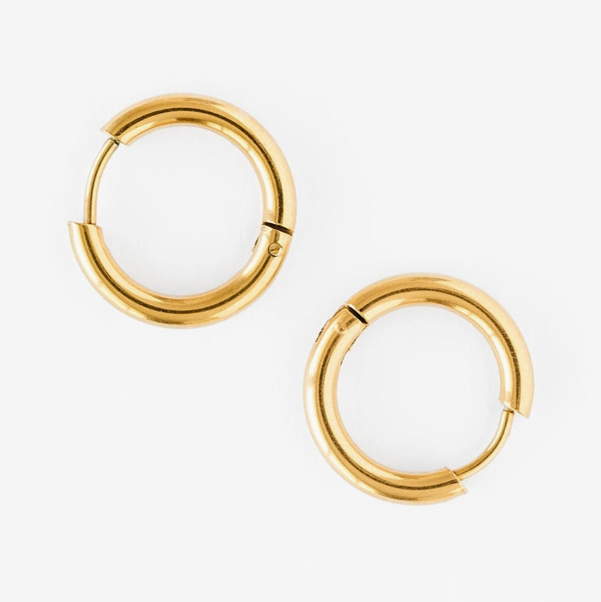 These minimal classic earrings are 14k gold & high quality surgical grade stainless steel, making them both hypoallergenic and comfortable for all-day wear. You can enjoy the freedom to run, shower, sleep, play, create, and travel without having to take them out.