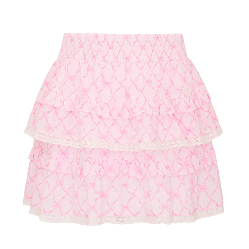 Twirl into springtime style with LoveShackFancy's Billie Skirt in Pink Bows! This charming pull-on skirt features a smocked waistband for a comfy, flattering fit that requires zero fussing. Delicate tiered layers adorned with lace or ruffled trim create movement and dimension, while an allover bow print brings cheerful color to your wardrobe. Crafted from soft cotton and true to size, it's the perfect piece for effortless, playful days. Hand wash to keep it looking fresh.