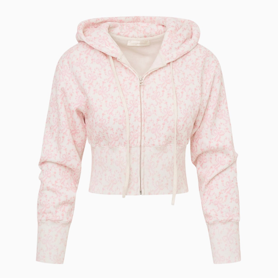 The Arienne Hoodie is a cropped, easy throw-on layer with a playful, polished finish. Designed with a doubled hood for structure, adjustable drawcords, and a two-way zipper, it blends comfort with versatility. Ribbed cuffs and a higher ribbed hem give it a clean, flattering shape, while the all-over print adds a fun pop to any active look. Finished with an “LoveShackFancy” detail above the sleeve, it’s the perfect piece to top off your set or style on the go.