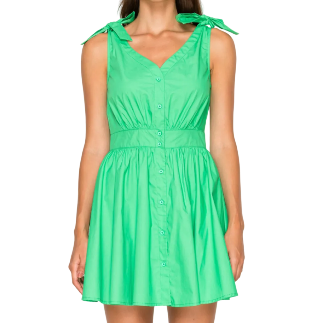 Slip into effortless elegance with this charming green poplin dress. Featuring a flattering fit-and-flare silhouette that skims your curves just right, it's designed for all-day comfort and confidence. The front button-up closure makes getting dressed a breeze, while delicate bow details add a playful touch of personality. Perfect for casual outings or dressed-up occasions, this versatile piece transitions seamlessly from day to night.